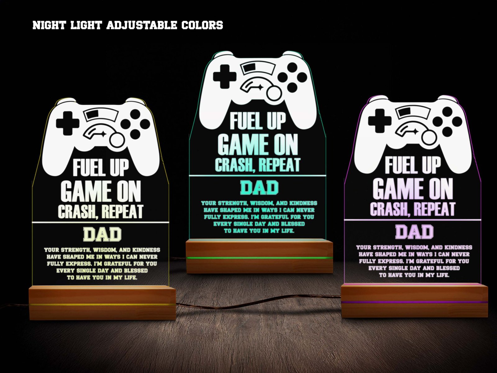 6”x9” Gamer Night Light: Create a magical atmosphere with our 6”x9” personalized gamer night light, ideal for bedrooms, living rooms, or workspaces. It features a pinewood block base with a 2K gloss coating, an acrylic sheet for displaying photos, and LED lights with 16 RGB colors and 4 flashing modes. 3 ft. USB cable with on/off button. This nightlight can be personalized with your name.