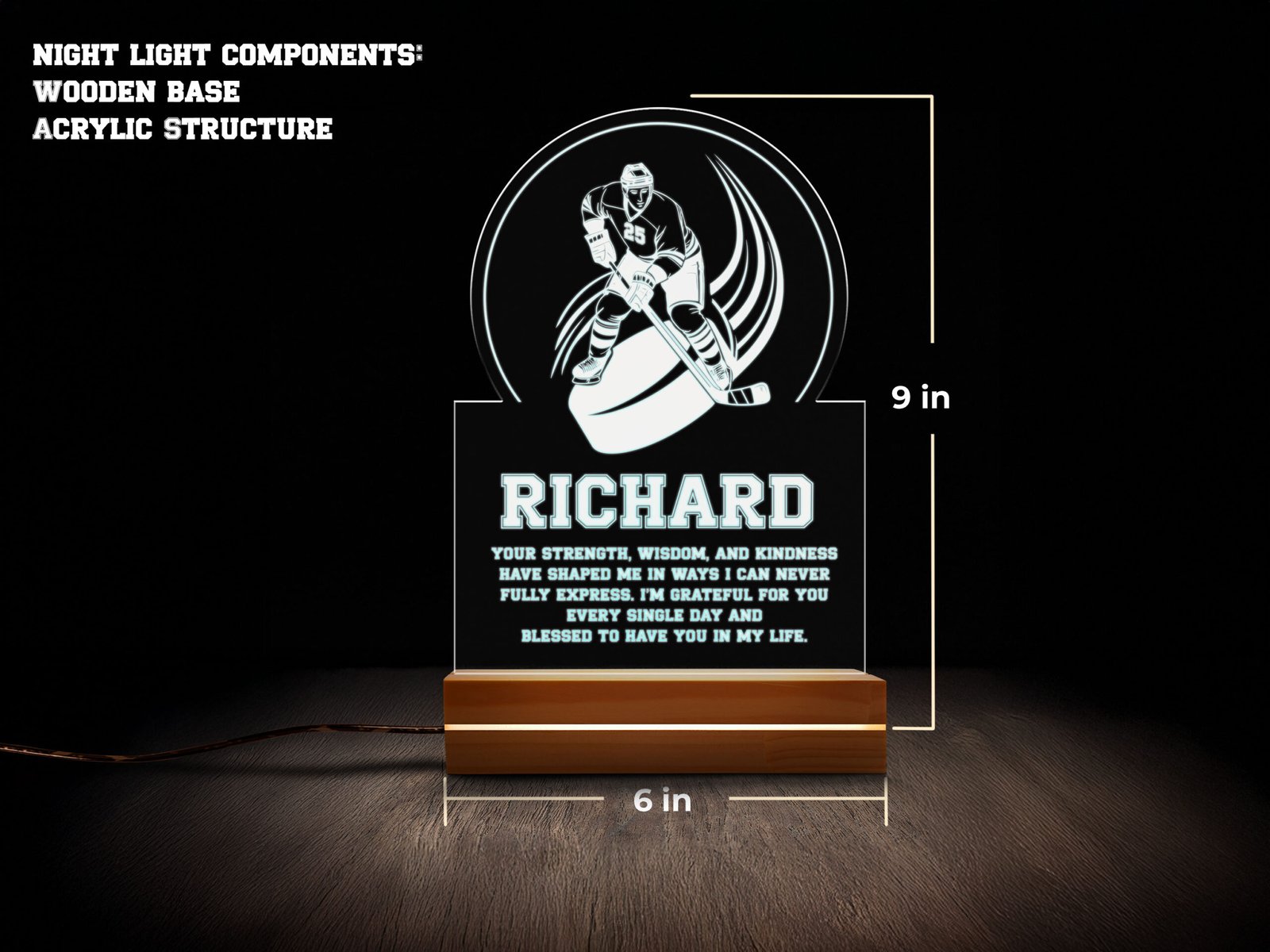 • 6”x9” Hockey Night Light: Create a magical atmosphere with our 6”x9” personalized sports night light, ideal for bedrooms, living rooms, or workspaces. It features a pinewood block base with a 2K gloss coating, an acrylic sheet for displaying photos, and LED lights with 16 RGB colors and 4 flashing modes. 3 ft. USB cable with on/off button. This nightlight can be personalized with your name.