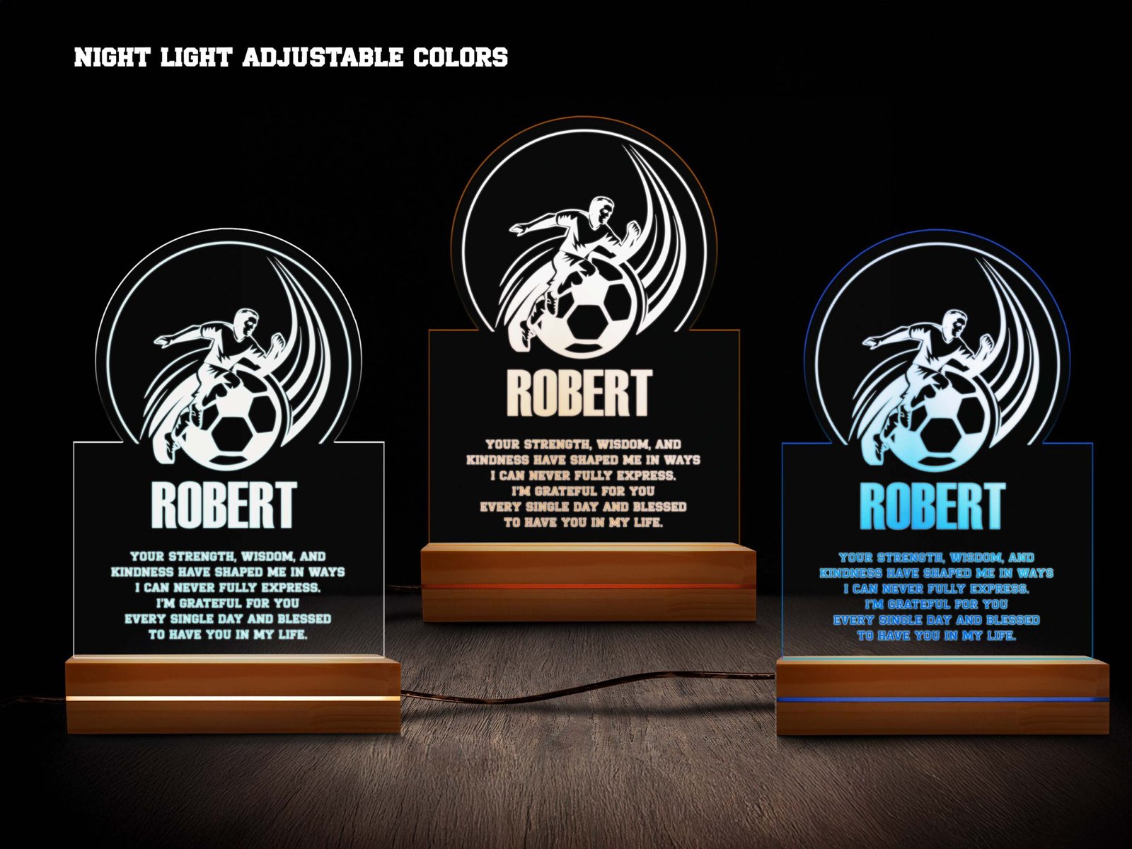 6”x9” Sports Soccer Night Light: Create a magical atmosphere with our 6”x9” personalized sports night light, ideal for bedrooms, living rooms, or workspaces. It features a pinewood block base with a 2K gloss coating, an acrylic sheet for displaying photos, and LED lights with 16 RGB colors and 4 flashing modes. 3 ft. USB cable with on/off button. This nightlight can be personalized with your name.