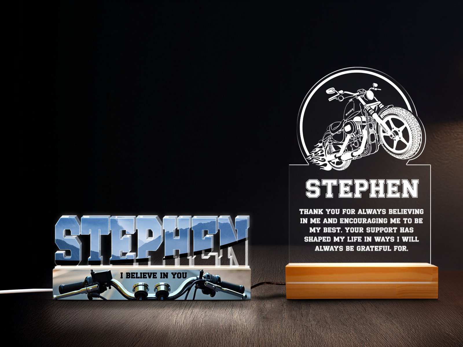 - 6”x9” Motorcycle Night Light: Create a magical atmosphere with our 6”x9” personalized motorcycle night light, ideal for bedrooms, living rooms, or workspaces. It features a pinewood block base with a 2K gloss coating, an acrylic sheet for displaying photos, and LED lights with 16 RGB colors and 4 flashing modes. 3 ft. USB cable with on/off button. This nightlight can be personalized with your name.
