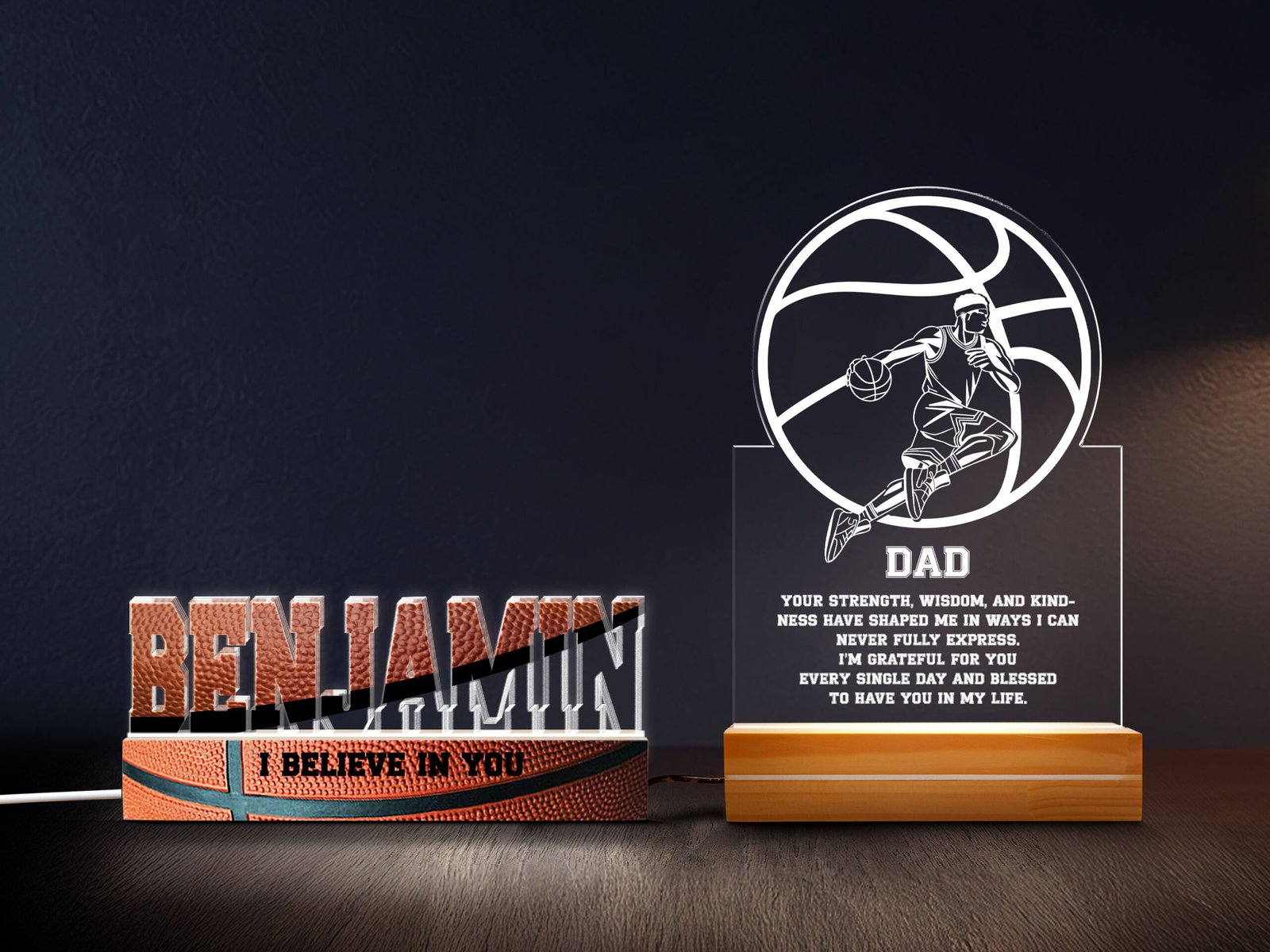 • 6”x9” Sports Basketball Night Light: Create a magical atmosphere with our 6”x9” personalized sports night light, ideal for bedrooms, living rooms, or workspaces. It features a pinewood block base with a 2K gloss coating, an acrylic sheet for displaying photos, and LED lights with 16 RGB colors and 4 flashing modes. 3 ft. USB cable with on/off button. This nightlight can be personalized with your name.