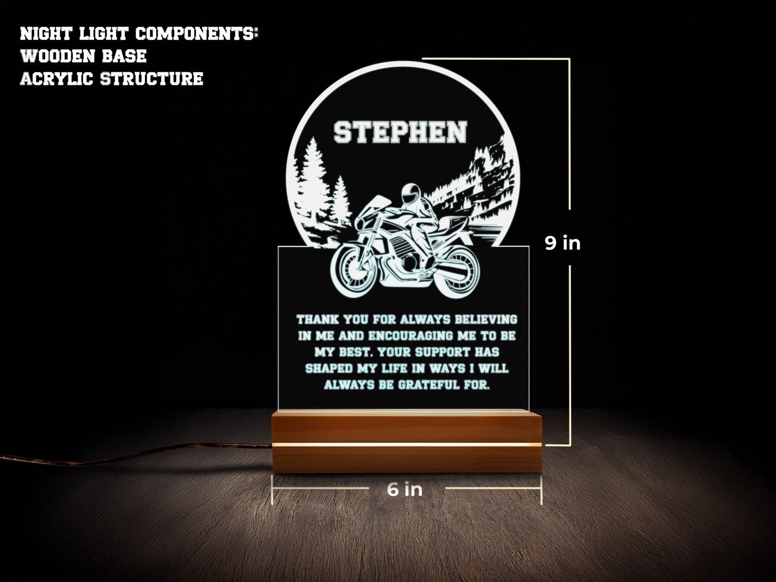 • 6”x9” Motorcycle Night Light: Create a magical atmosphere with our 6”x9” personalized motorcycle night light, ideal for bedrooms, living rooms, or workspaces. It features a pinewood block base with a 2K gloss coating, an acrylic sheet for displaying photos, and LED lights with 16 RGB colors and 4 flashing modes. 3 ft. USB cable with on/off button. This nightlight can be personalized with your name.