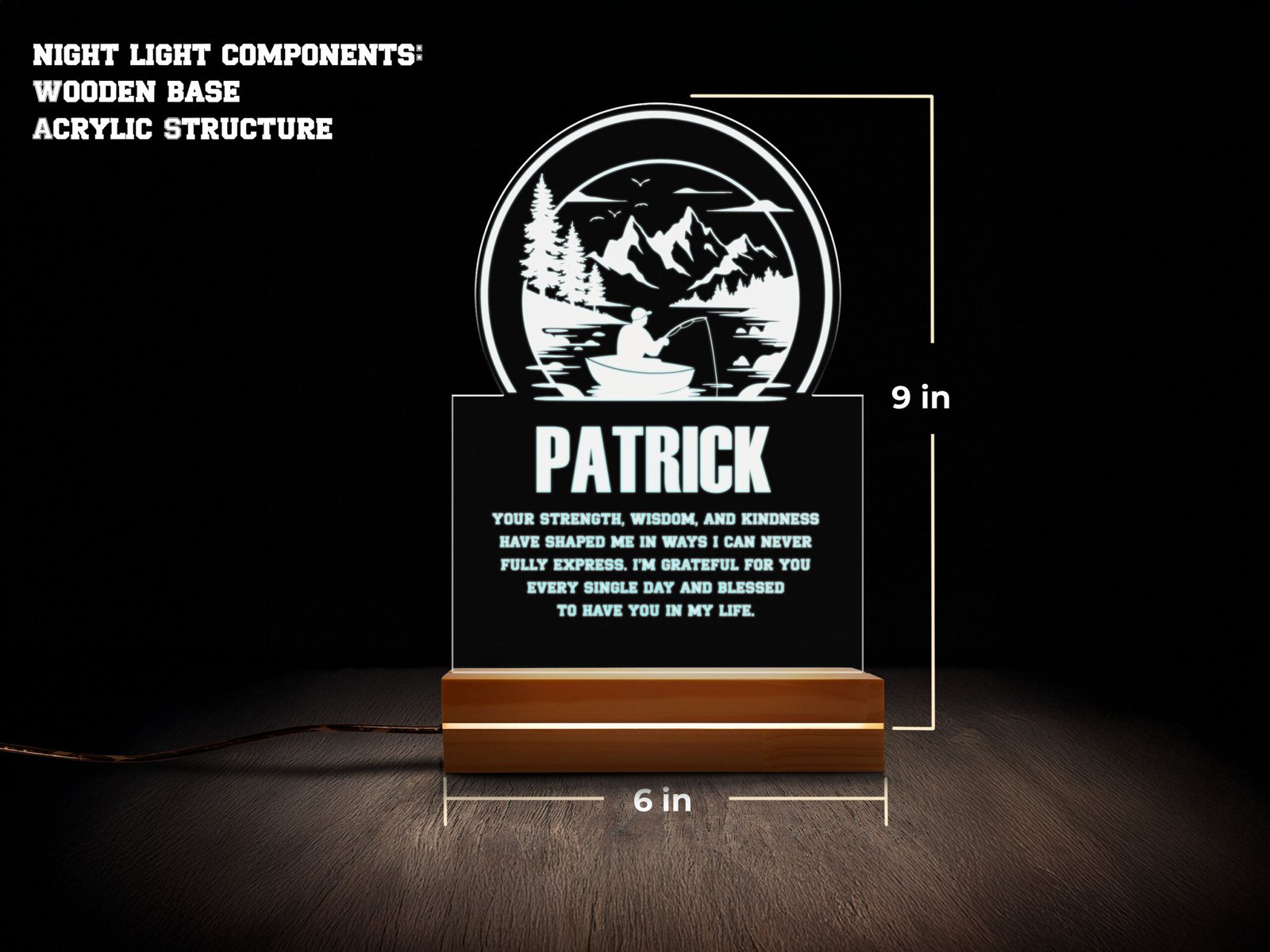 • 6”x9” Fishing Night Light: Create a magical atmosphere with our 6”x9” personalized fishing night light, ideal for bedrooms, living rooms, or workspaces. It features a pinewood block base with a 2K gloss coating, an acrylic sheet for displaying photos, and LED lights with 16 RGB colors and 4 flashing modes. 3 ft. USB cable with on/off button. This nightlight can be personalized with your name.
